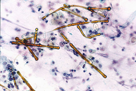 炎症性背景の中に褐色調で節を有する棒状の物質を認める。いわゆる含鉄(アスベスト)小体である。