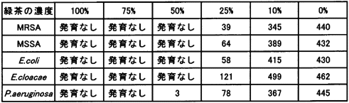 | 使用茶葉:緑茶(煎茶)、烏龍茶、紅茶、ほうじ茶 使用菌株:新生児病棟の患者検体より、分離した菌株を使用した。 @ MRSA TSST-1産生株 A MSSA B E.coli C Enterobacter cloacae D P.aeruginosa
