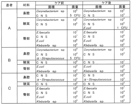 | それぞれの場所においてケア前後の細菌培養を行った。検出菌種・菌量にこれといった差は認められなかった。この時は、MRSAは検出されなかった。 MRSAの保菌の有無にかかわらず、日常的に緑茶ケアを継続したところ、保菌者がいた病棟から8ヶ月間MRSAが検出されないという効果がみられた。その後MRSAが検出されたが、緑茶ケアにより消失した。 ―MRSA検出例― 平成11年度MRSA陽性者4名検出回数14回 平成12年度MRSA陽性者1名検出回数1回 平成13年度MRSA陽性者1名検出回数3回