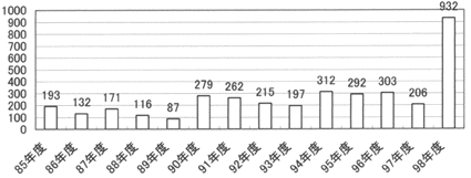 | 対象は図1に示した1985年〜1998年度までに受診した3,697名である。その内訳は、1985〜1997年度までが、2,765名で、1998年度は932名であった。 PSA測定キットは、アキシムPSAダイナパックを用い、基準値は、4.0ng/ml以下とした。 |