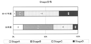 | @1985年度から、延べ3,697名の前立腺検診を行い、42例(1.1%)の前立腺がんを検出した。 A1998年度はPSA単独の検診を行い受診者の肉体的負担が軽減され、受診者数が大幅に増加した。(受診者数932名、がん発見率1.4%) BPSA単独の検診に切り替えたことで早期前立腺がんの検出割合が増加し、PSAのスクリーニング検査としての有用性を認識できた。 |