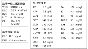 5.入院時理学所見 体温:36.6℃。血圧:77/52mmHg。 脈拍:92/min。貧血、黄疸なし。 腹部、軟。 右肩腫脹あるが、外傷を疑わせる所見なし。 6.入院時検査所見(表1)血圧低下、血小板低下、CRP高値、低アルブミン血症、肝腎機能異常、CPKは正常値内だが高めを示した。 表1 入院時検査所見(9月4日)