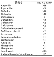 & Mittwer染色)にてグラム陰性桿菌を検出。 2. 分離培養:5日の剖検時に提出された右三角筋深部の壊死性組織部からの検体を5%羊血液寒天培地(BBL 3.同定検査:分離されたコロニーは純培養状であり、壊死部の直接塗抹標本からのグラム染色所見と一致したグラム陰性桿菌であった。オキシダーゼ試験では陽性を示した。同定感受性検査は、MicroScan−WalkAway96TM(DADE BEHRING)のNeg Combo5Cパネル 4.薬剤感受性検査:表2に示す通りで、ペニシリン系薬剤には耐性を示し、それ以外の抗生剤には良好な感受性成績を示した。