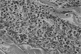 ×400)した結果からは、上腕骨骨膜から三角筋肉にかけて筋組織の壊死と筋束間に好中球の浸潤の目立つ膿瘍形成が見られ、その間に桿菌を確認できた。また組織標本のグラム染色(図4