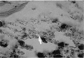 | 溶連菌感染後糸球体腎炎は、溶連菌の感染後1〜3週間の潜伏期を経て、血尿、浮腫あるいは高血圧のいずれかを伴い、低補体血症を呈し小児に多く発症する。 組織学的には、糸球体の著しい腫大、糸球体内に赤血球がほとんどみられないこと、糸球体内の核が増加していることを特徴とする。腫大した糸球体は、メサンギウム細胞や内皮細胞の増殖を示し、急性期には多核白血球やマクロファージの浸潤を示す。また、蛍光抗体法では血管係蹄壁に沿ってIgGやC3の沈着を認める。電顕的には、基底膜上皮側にみられる高電子密度の瘤状の突出物hump(写真1、2)を特徴とする。humpは、形、大きさが様々でしばしば均質な構造を示し、急性期に出現し数週から数カ月で基底膜内に埋め込まれ数ケ月で消退する。humpを覆う上皮細胞は、足突起を失い細胞質にアクチンフェラメントの集合による高電子密度の帯がhumpを覆うようにみられる。 他の急性腎炎症候群を呈する疾患との鑑別としては、膜性増殖性腎炎やIgA腎症などがある。 膜性増殖性腎炎では、増殖の主体がメサンギウム細胞と単球であり、メサンギウム細胞が基底膜と内皮細胞の間に増殖侵入するmesangial interpositionを呈すること、IgA腎症の急性期ではhumpを欠くことにより鑑別される。 |