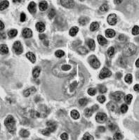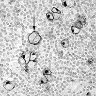 HLの組織像は様々な炎症性背景に数の少ない、大型の特異細胞が散見されるのが基本像である。新WHO分類では典型的なHRS細胞の出現するclassical HL(CHL)とpopcorn細胞の出現するnodular lymphocyte predominance HL(NLPHL)とに大別され、CHLはさらにlymphocyte rich (LR), mixed cellularity (MC),nodular sclerosis (NS),lymphocyte depletion(LD)の4型に細分される。H/RS細胞は小リンパ球より大きい光輝性核小体がみられ、その周りに明庭を有する大きな核をもつ細胞で、単核のものをH(Hodgkin)細胞、2核以上のものをRS(Reed-Sternberg)細胞という(図1,2,3)。多分葉の核をもつ細胞をpopcorn細胞と言う(図4)。 |