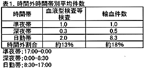 移転前の旧千葉市立病院当時より時間外業務は検査技師1名で行われていた。1980年度以前は待機制で1980年度以降は日当直が行われており、輸血検査の24時間体制はとられていた。しかし、血液製剤の保管や発注は薬剤部、交差適合試験や血液型検査など輸血検査は臨床検査科で行う二元管理体制であり効率が良いとはいえなかった。夜間休日は検査技師が一人しかいないために、検査技師による血液型のダブルチェックが行えず当直医師に確認を依頼していたが、多忙な当直医を検査室に呼ばねばならず、医師の負担になっていた。また、不慣れな血液型検査を行うことはかえって危険であり、形式的なものになってしまっていた。薬剤部は夜間当直を行っていなかったため、当直師長が代行して製剤の発注、払い出しなどを行っており、放射線照射などの業務も新たに増加し、未照射血を輸血する事故が起きた。 |