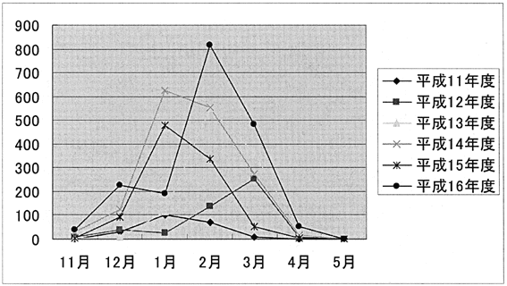 | 年度別の月間の依頼件数状況を集計して見ました。年度によって、依頼件数のピークは変動しており、11年度は、1月にピークがありますが、ほぼ横這い。12年度、13年度は、1月から急激に増加していますが、12年度は3月、13年度は2月がピークとなっています。14年度、15年度は12月から増加し、1月にピークを迎えており、16年度は年末から1月にかけて依頼が少なくなったのですが、年明け2月から3月のはじめに急激な上昇がみられました。対象とした過去6年間では、平成16年度の異常発生をのぞき、全体としてピークが早まっている印象を受けます。これには気候の変化等の影響が考えられます。 | ||||||||||||||||||||||||||||||||||||||||||||||||||||||||||||||||||||||||||||||||||||||||||||||||||||||||||||