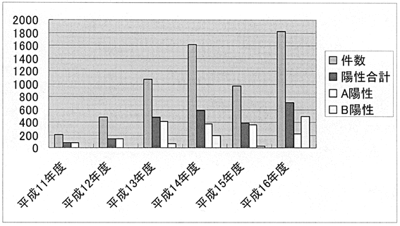 | 年度別の検査件数及び陽性件数は、毎年増加傾向になっており、特に、14年度、16年度は突出して増加しています。これはメディアでSARSや、鳥インフルエンザの驚異が取り上げられたり、検査キットの普及が影響している可能性も考えられます。 陽性件数は、検査件数が増加するに伴って増加しており、検査件数に対し陽性率は31%〜44%の間を推移しています。(11年40% 12年31% 13年44%14年36% 15年42% 16年37%) 15年度は、14年度に比較して検査件数は減少し、B+の患者が少なくなっています。16年度は、全体的にB陽性が多かったが、A陽性が2〜3月に 集中して多かったです。 |