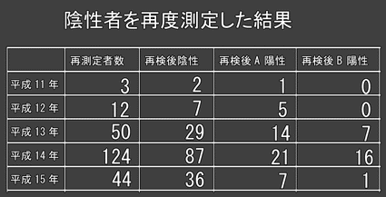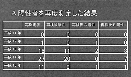 | A陽性者を再度測定した結果集計すると、16年度は、A型・B型の流行が混在しており集計からはずし、H13〜15年度でみると13年度は、11名の患者が陰性化し、5名の患者は、陽性。14年度は、20名の患者が陰性化し、7名の患者は陽性。15年度は9名の患者が陰性化し、2名の患者は陽性となりました。16年度は、A型・B型の流行が混在しており集計からはずしてみました。 | ||||||||||||||||||||||||||||||||||||||||||||||||||||||||||||||||||||||||||||||||||||||||||||||||||||||||||||