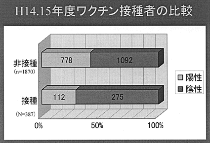 | 陰性者を再度測定した結果を表にしたものです。 N数の多いH12〜H15年度で見ると。12年度は、5名の患者が陽性化し、7名の患者は陰性。13年度は、21名の患者が陽性化し、29名の患者は陰性。14年度は、37名の患者が陽性化し、87名の患者は陰性。15年度は8名の患者が陽性化し、36名の患者は陰性となりました。 このように臨床症状と結果の不一致が生じる原因としては、ワクチン接種の有無、発症から検査までの時間、検体採取手技の影響などが考えられます。 H14.15年度にワクチン接種を受けた患者と非接種の患者を比較したものです。 ワクチンの接種を受けた患者の陽性率は、非接種の患者に比べ、1割程低くなっています。 |