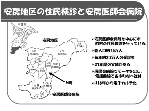 | 安房医師会病院は、安房郡市全域の40歳以上の住民を対象として地域住民検診を行っています。 その地域住民検診の主要な対象疾患は、糖尿病、高血圧症、虚血性心疾患、高脂血症、悪性腫瘍などの生活習慣病であり、悪性腫瘍を除けば、動脈硬化を促進させる、あるいは動脈硬化の進行に伴っておこる病態と考えられます。従って動脈硬化の経年的な状態をモニターし、そのデータを基に適切に対処法を講じる事ができれば、大部分の生活習慣病の発症あるいは合併症併発を防ぐことができると思われます。 |