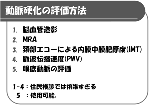 本来動脈硬化性病変の進行は、動脈血管自体の変化度により評価されるべきであり、これまで開発された方法には、脳血管造影、MRA、ならびに頸部エコーによる頚動脈の内膜中膜肥厚度(IMT)や脈波伝達速度(PWV)などがあります。しかしながら、住民検診レベルでは脳血管造影、MRAは行えず、さらに、IMT、PWVも手間と時間がかかるため取り入れる事が出来ないのが現状です。一方、動脈硬化の進行度を脳血管、内頚動脈の第1枝の血管である眼底動脈で判定可能なことは、キース-ワグナー分類、シャイエ分類でも明らかなように既定の事実と考えられます。 |