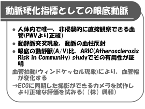 動脈硬化指標としての眼底動脈は人体内で唯一非浸襲的に観察できる血管であり、動静脈交叉現象、血柱反射から細動脈の硬化の程度を見極める事ができます。また、近年アメリカのAtherosclerosis