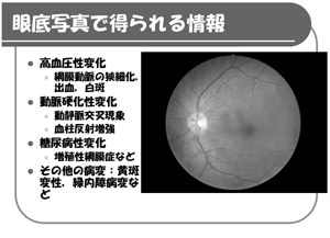 このスライドは、高血圧性変化、動脈硬化性変化、糖尿病性変化など、眼底写真で得られる一般的な情報を示しています。 |
