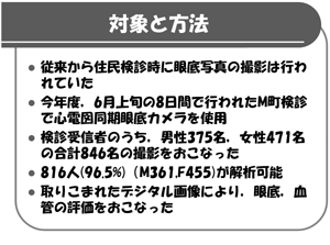 安房地域では従来から住民検診時に眼底写真の撮影は行われており、今年度、6月上旬の8日間で行われたM町の検診において心電図同期眼底カメラを使用しました。検診受診者のうち、男性375名、女性471名の合計846名の撮影を行いました。このうち816名の受診者について解析が可能であり、撮影した眼底写真画像をコンピューターに取り込み、眼底血管の評価を行いました。 |