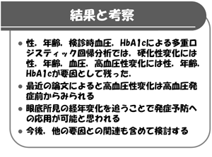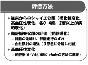 評価の方法としては、従来から行われていたシャイエの分類で硬化性変化、高血圧性変化を各0〜4度に分類し、2度以上を病的変化と評価しました。 硬化性変化の評価は、動静脈交叉部の静脈の先細り、静脈走行のずれ、血柱反射の増強を判定しました。 高血圧性変化については動静脈(A/V)比によって評価しました、これはARIC Studyの方法に準拠した方法で行いました。 |