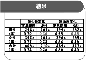 硬化性変化について病的変化は男性0.30、女性0.23の割合で現れ、高血圧性変化は男性0.45、女性0.36の割合で病的変化が現れ、ともに男性に多く変化が現れていました。 |