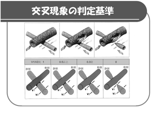 このスライドは、交叉現象の判定基準を表しています。判定の原理は動脈硬化が進行すると、交叉部では静脈の天井部と動脈の床部分の共有された外膜に“引きつれ力”が加わり、さらに静脈内膜への“ずり応力”の変化も加わり、その結果、交叉部直下の静脈径が狭小化します。その狭小部と通常部の比を数値化し評価しました。 |