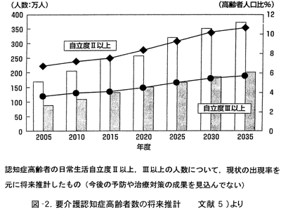 考 案![]() 保健・医療・福祉関係者の中でも、65歳以上で最も多い認知症の原因となるアルツハイマー病についての認識は概して充分なものではないといわれている。アルツハイマー病根治的治療法の確立には、アルツハイマー病で発生する神経細胞死の分子メカニズムやA 蓄積原因を解明することであり、そのことが記憶力・認知能力をコントロールし、明確な診断に結びつく。しかし、現状のアルツハイマー病診断に際しては、他臓器障害のように血液中などに疾患マーカーとなりうる有用なものがないため、脳萎縮をみるMRI、CT等及び症状の経過から脳血管性認知症とを区別し、うつ病、意識障害、せん妄や良性健忘症を除外してアルツハイマー病を推定している。 アルツハイマーによる認知症は、患者本人だけでなく介護をする側の人達にとっても大きな問題となる(どこで、誰が、どのような方法で介護をするかなど)。患者を含めたその何倍かの家族、介護をする人達が経済的、精神的重圧などの問題と向き合っているといえる。元来、我が国の老人を対象とした関連福祉対策の主なものとしては、1963年に老人の人権を保障するというコンセンサスのもとに老人福祉法が成立し、1973年には高齢者医療の無料化、その後、老人医療費の高騰により1982年にこれを改正、1989年には福祉推進介護サービスを主とした10年戦略のゴールドプラン策定、1994年にはこの考えをさらに進めた新ゴールドプラン、1997年介護保険法が成立し、2000年には介護を必要とする高齢者を国民全体で支えていこうとする介護保険制度が導入された。このようなもと、高齢者介護の背景として社会情勢並びに家族環境の変化などが高齢者への介護支援の必要性をもたらし、様々な福祉ニーズを生み出してきた。しかし、現在の介護サービスは実際に現場で介護にあたる専門員数の不足や特別養護老人ホーム、介護老人保健施設などの不足からであろう入所待機の患者も多く、利用負担の不平等感がある。介護の質や標準化の問題、さらには居宅介護における主たる介護者が60歳以上という場合も多く、いわゆる「老老介護」や常なる経済的問題もある。このような事からも今後、増加するであろう認知症患者の要介護に応じた適切なサービスの提供の場がより以上に求められている。また、要介護の軽度な患者が短期間に重度化することが多いという報告もあり、プライマリーな時期での適切な介護・ケアが悪化を防ぐ上で重要なことが推察される。脳に生じるA の蓄積を抑える薬は、まだ実用化されておらず動物実験等で蓄積抑制剤、溶解薬、A のワクチンなどの研究が盛んに実施されている。抗認知症薬としては、アルツハイマー病に対して塩酸ドネペジル(アリセプト)が認知症を遅らせることを目的として使用されるようになった。しかし、アルツハイマー病自体の進行により薬効も少なくなるため、軽度認知障害を正確に把握し医学的に早期の対応が認知症患者本人及び介護者にとって有益なものとなる。 |
