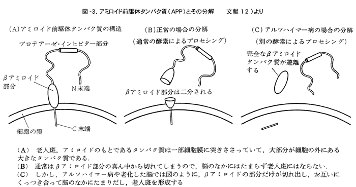 | 3.アルツハイマー型認知症への医学的対応 器質性認知障害は、脳血管性のものとアルツハイマー型でその大半を占めている。アルツハイマー病は進行性の認知障害と記憶低下を特徴とする神経性疾患である。病理学的には、神経細胞の脱落と脳細胞内にたまる神経原繊維変化を構成するリン酸化タウタンパク質の蓄積及びアミロイドβ―タンパク質(以下Aβ)を主成分とする老人斑の出現がある。タンパク質は多数の形状を作ることが可能であるが、特有の三次構造を取ることで生理活性を持つこととなる。しかし、老化によりタンパク質合成の低下や分解速度が遅くなり、代謝機能の低下・変化などのため変異タンパク質が蓄積してくる。これらのことと同様に脳内Aβの集合・形成が老化に伴い生じてくることが考えられる。アルツハイマー型認知症の場合このAβと呼ばれる40〜42のアミノ酸よりなる小ペプチドが大脳皮質に沈着する。そのまわりを活性化したアストロサイトやミクログリアといったグリア細胞(散在している神経細胞の隙間を支持組織としての機能や、神経細胞が破壊された時に補填する役割を果たす)が集積し、活性酸素による酸化的ストレスを生じる。7)元来、脳はカテコールアミンなど酸化されやすい物質が多くあり、フリーラジカルを発生しやすく、これら酸化的ストレスによって神経細胞やシナプス機能の低下、リン酸化などの情報伝達異常が起こるものとして、認知機能障害要因の一つにこの活性酸素が挙げられている。8) Aβは、C末端の違いによりAβ40とAβ42の分子種があり、9)家族性アルツハイマー病では凝集性の強いAβ42の産生増加が発症に関与するといわれている。10)この老人斑の出現並びにAβ量や繊維化の増加は認知障害症状とは必ずしも相関せず、Aβが神経細胞死を獲得するには、特定の構造を取った時であり、それはAβ42の方がより強いという。Aβは神経毒性を持つため、認知症の発症に重要な役割を果たすといわれている。その神経毒性を発現するには自己会合が必要とも考えられており、星らは、11)Aβの様々な重合体から神経毒性を担う構造として「アミロスフェロイド」を特定している。 弧発性アルツハイマー病では主にAβの分解系の異常が原因と推察され、城谷らは、10)プロテアーゼであるネプライシンに着目して、ネプライシン欠損マウスを作製した。この欠損マウスは野生型マウスに比べ、明らかにAβ42分解能が低下していることを示し、他のプロテアーゼに考慮しつつも脳内Aβ量の制御系におけるネプライシンの重要性を示唆している。β-アミロイド仮説では、アミロイド前駆体タンパク質(以下APP)のプロセシングによってつくられるAβの産生と分解のバランスがくずれ長期に渡って脳内に沈着することにより神経細胞の機能低下、損失が起こるとされている。そこで生理的ペプチドとして産生されるAβも含めたAβ生成を抑制する方法として、APPが -セクレターゼにより切断されることによって沈着性Aβがつくられる元となるため、β-セクレターゼ阻害剤を使用する方法やアセチルコリン系の機能を賦活させることを目的としたアセチルコリン分解酵素阻害剤が開発されてきた。また、アルツハイマー発症とコレステロール代謝との関係において、Aβの産生が高コレステロール環境下で促進されるというものや関与を示す報告がある。13)高コレステロール食の実験動物モデルにおけるアルツハイマー症病理変化の形成促進、コレステロール輸送の役割を果たすアポリポタンパクEとアルツハイマー発症の関係、高コレステロール血症患者に使用される生合成系阻害剤であるスタチン服用者のアルツハイマー発症抑制など中枢神経におけるコレステロール代謝は血液脳関門に隔てられた閉鎖系であることを含めた検討の必要性を示している。さらに、ヒト変異APP遺伝子を過剰発現させたトランスジェニックマウスでは、脳内にAβの沈着、老人斑の形成がみられる。これらのマウスを使いAβワクチンを投与しAβに対する抗体を産生し、脳内のAβ老人斑を消失させる方法や直接抗Aβ抗体を投与することによりアルツハイマー病治療に関する免疫学的方法もトライアルされている。14)ヒトへの副作用7)や抗体そのものが血液脳関門を通過するかなど検討の余地があるとされるが、Aβワクチン療法も今後に期待されるところである。 |